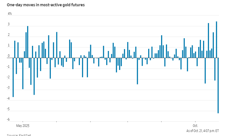 现货黄金下跌5.7%至每盎司4,107.68美元。最活跃的黄金期货合约下跌5.7%,报每盎司4109.10美元。近期合约也下跌5.7%,报4087.70美元。