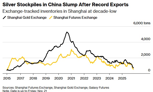 这轮库存下降发生在中国白银出口激增之后——10月出口量飙升至超过660吨,创历史新高。