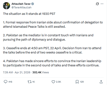 巴基斯坦信息部长阿塔乌拉·塔拉尔(Attaullah Tarar)在社交媒体平台X上表示,伊朗方面尚未就派遣代表团参加伊斯兰堡和平谈判作出正式回应。他指出,巴基斯坦正在与伊朗保持持续沟通,并继续通过外交与对话推动局势降温。
