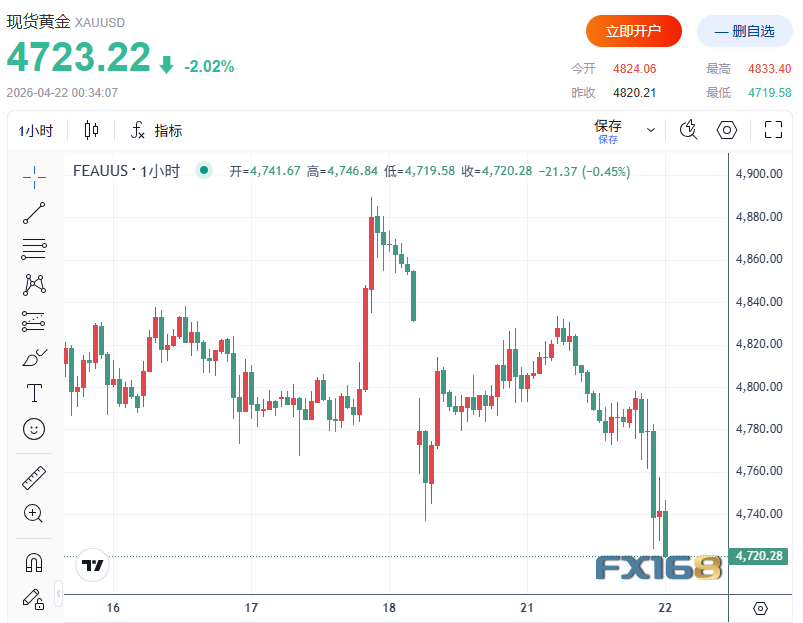 美市盘中,现货黄金扩大跌幅至超2%或逾100美元,跌至4720美元下方。
