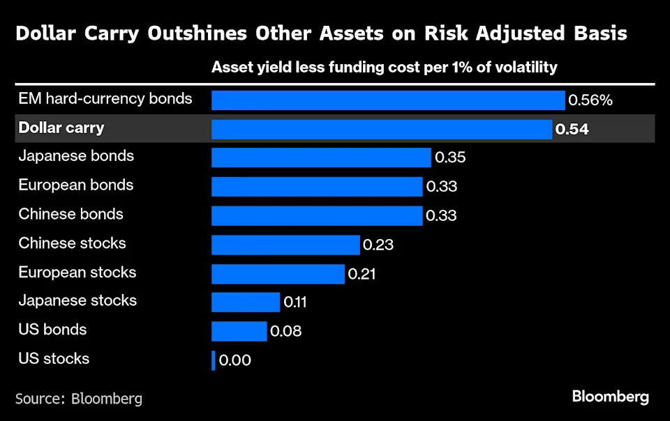 根据彭博社测算,在风险调整后,投资者通过借入低收益货币(如日元或瑞士法郎)并投入美元资产所获得的回报,已超过欧洲股市和中国国债等主要市场。换言之,美元套息(carry trade)策略正重新跑赢大多数风险资产。