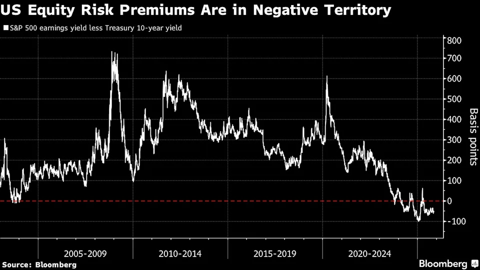 与此同时,投资者担心人工智能驱动的全球股市上涨可能难以持续。标普500指数自4月低点以来反弹逾三分之一,但风险溢价(股票收益率减去10年期美债收益率)已转为负值,意味着在风险调整后,美股投资几乎没有超额回报。