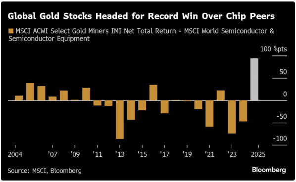 FX168财经报社(欧洲)讯 周五(10月3日),尽管今年人工智能(AI)与芯片股话题不断升温,但真正的赢家却是金矿股。根据 MSCI公司(MSCI Inc.) 的数据显示,全球黄金股票指数今年已飙升约 135%,紧随金价的强劲上涨。这一表现创下对全球主要半导体公司指数的最大超额收益纪录,后者今年仅上涨约 40%。