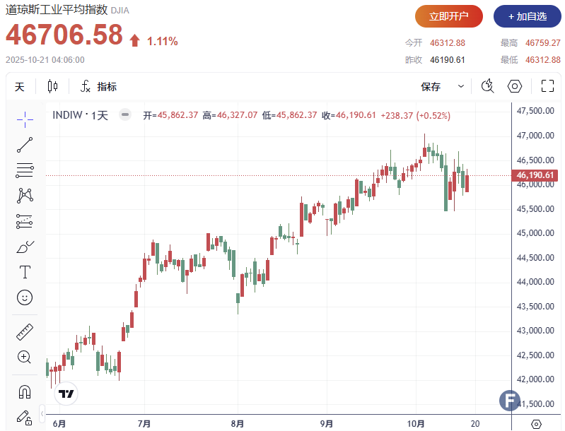 FX168财经报社(北美)讯 周一(10月20日),美股全面走高,受苹果公司(Apple, AAPL)强劲上涨带动,同时投资者押注美国政府停摆即将结束,并关注本周即将公布的一系列重量级企业财报与通胀数据。#美股收评#