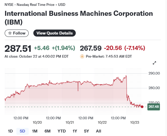 FX168财经报社(北美)讯 周四(10月23日),国际商用机器公司(简称IBM,股票代码:IBM)盘前股价下跌逾7%,此前公司公布的季度业绩显示,其核心云计算软件部门增长放缓,引发投资者对这家“蓝色巨人”(Big Blue)能否抓住云计算与人工智能(AI)需求爆发机遇的担忧。
