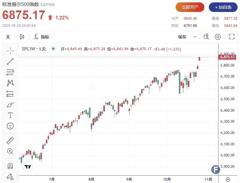 标普500指数上涨 1.22% 至 6,875.12点,首次收于6800点上方;纳斯达克综合指数 大涨 1.9% 至 23,637.46点,受英伟达及其他半导体股走强推动;道琼斯工业平均指数上涨 337.47点,涨幅 0.71%,收于 47,544.59点。