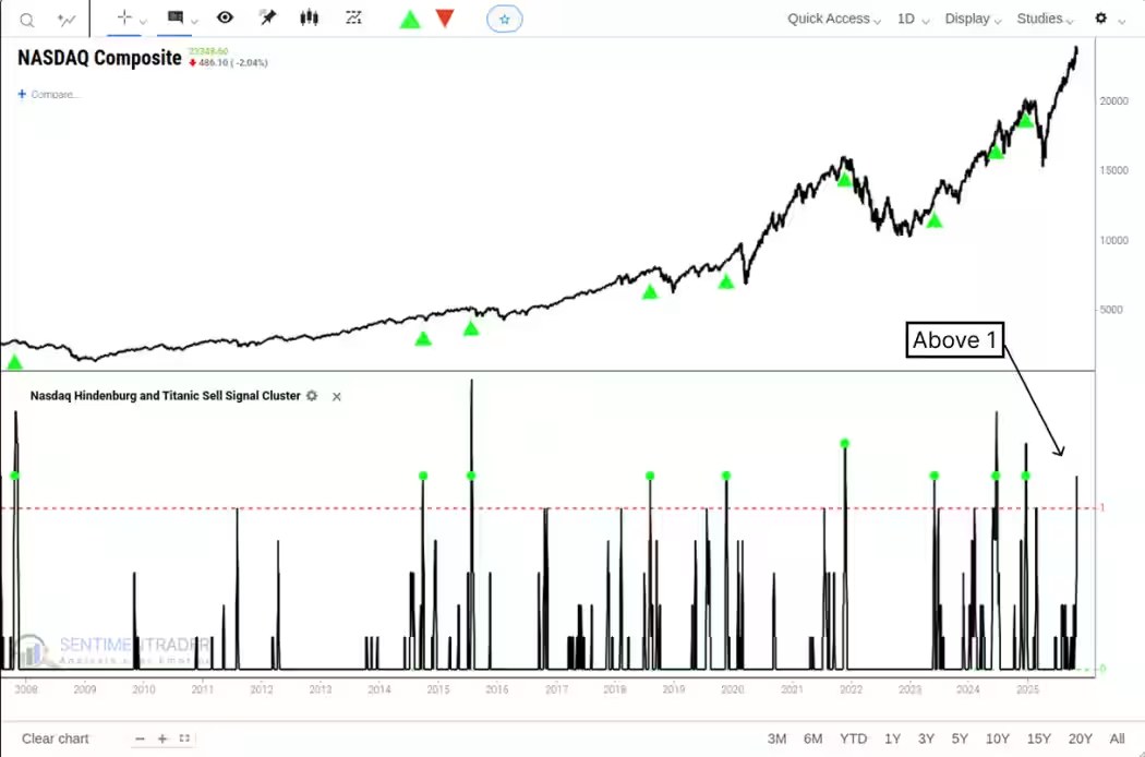 过去五个交易日内,“纳斯达克泰坦尼克信号(Nasdaq Titanic Syndrome)”已出现四次,而“兴登堡预兆(Hindenburg Omen)”也触发了两次。