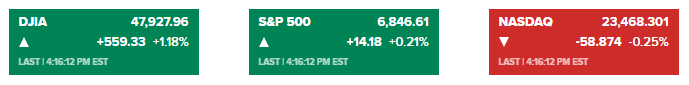 美股三大股指当日收盘涨跌不一:道琼斯工业平均指数收涨559.33点或1.18%,报47,927.96点,创一个月来最大单日涨幅;标普500指数上涨0.21%,报6,846.61点;纳斯达克综合指数下跌0.25%,报23468.301,541点,连续第二日跑输大盘。