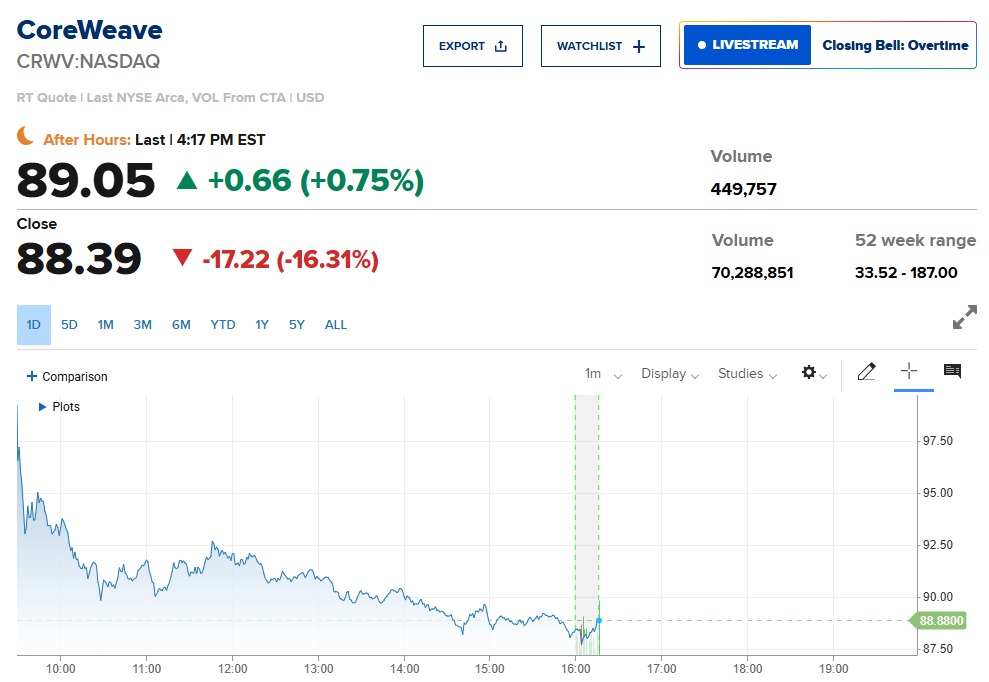 人工智能主题股再度成为抛售重灾区。AI云计算基础设施公司CoreWeave公布的营收指引远低于预期,股价暴跌16%,引发AI板块整体承压。