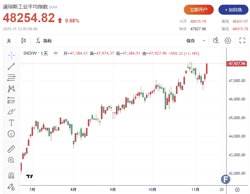 FX168财经报社(北美)讯 周三(11月12日),道琼斯工业平均指数首次收于48,000点上方,创下历史新高。投资者押注美国史上最长政府停摆或将在本周迎来终结。#美股收评#