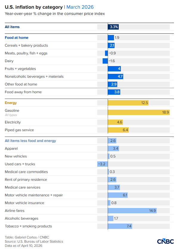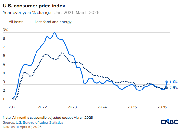 美国劳工统计局周五(4月10日)公布的数据显示,3月消费者价格指数(CPI)同比上涨3.3%,高于2月的2.4%。这是自2月28日伊朗冲突爆发以来的首份通胀数据,反映出中东局势在短短一个月内已对美国消费者产生实质性冲击。