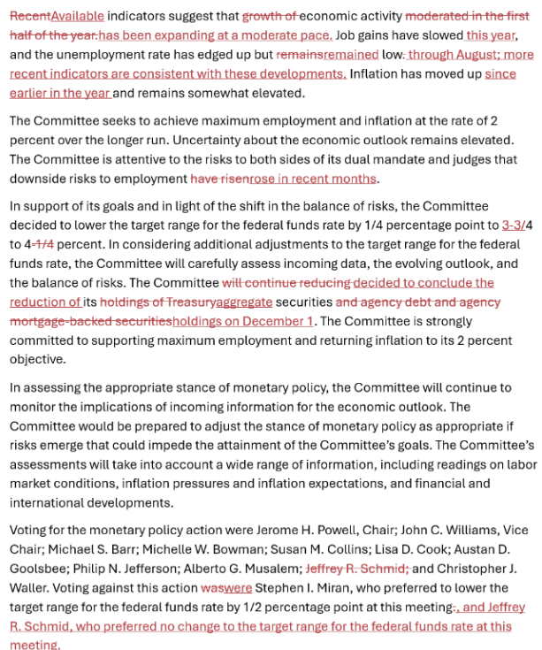 与9月份的声明相比,措辞从“经济放缓”转向“温和增长”,同时更关注就业下行风险。