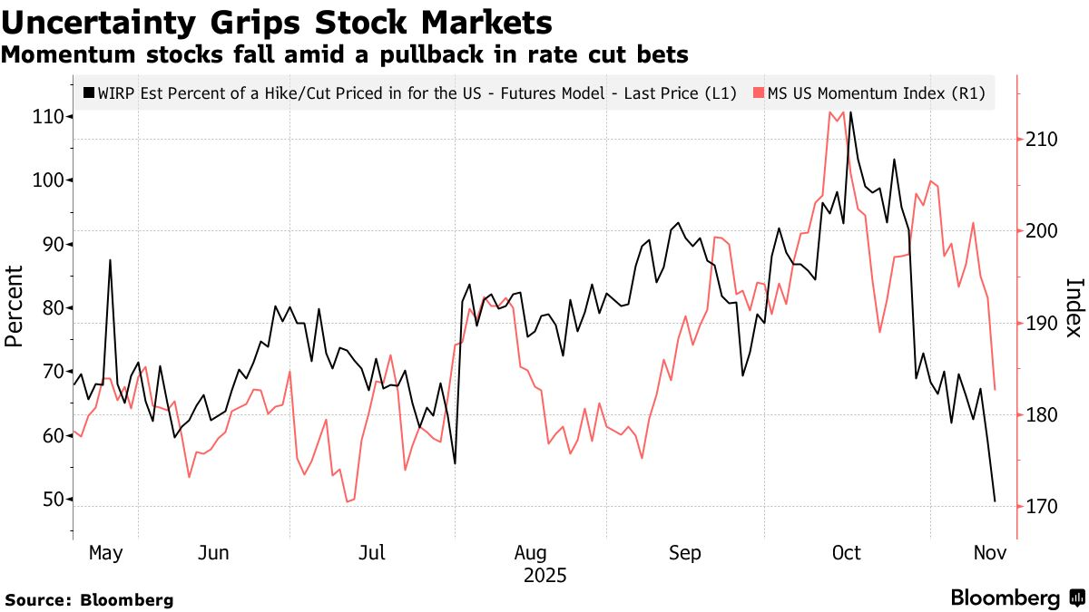 市场现在仅定价49%的概率认为美联储将在12月降息25个基点,而本周早些时候这一概率还略高于60%。此外,由于美国政府停摆导致部分经济数据迟迟无法公布,再加上AI热潮推动的科技股估值泡沫争议,金融市场整体情绪愈发紧张。