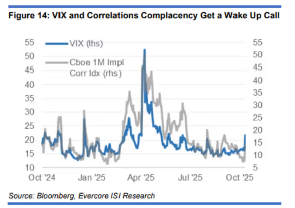 “上周五因关税政策引发的抛售暴露了市场的自满情绪,并提醒投资者,即使是最强劲的牛市也会出现调整。”他说。他指出,市场的低波动性和个股之间的高度联动,至少在上周五之前,体现出过度自满的迹象,而这在10月的财报季开启之时是非常罕见的。