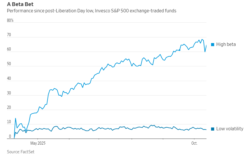 标普500高贝塔指数(代表波动最大的股票)在过去六个月内涨了近70%,但周五下跌近5%。而对应的标普500低波动指数,在前期仅上涨了约7%,却在周五小幅上涨。