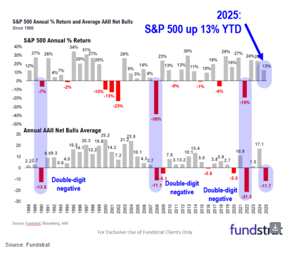 他还表示,目前AAII的悲观情绪水平,与历次股市大幅下跌的年份相似。“但2025年标普500已经上涨了13%。这就是为什么这被称为‘最不受欢迎的V型反弹’。”