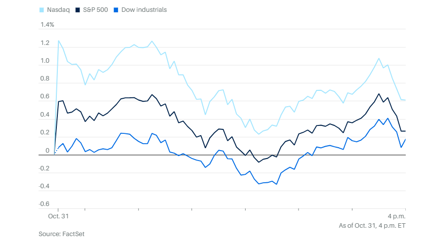 周五美股三大指数小幅上涨。道琼斯工业平均指数上涨41点,涨幅为0.1%。标准普尔500指数上涨0.3%。纳斯达克综合指数上涨0.6%。标普和道琼斯指数都录得自2022年以来表现最好的十月,纳斯达克则创下自2021年以来的最佳十月表现。