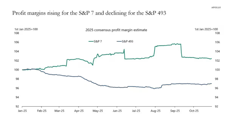 另一方面,阿波罗全球管理公司的托斯滕·斯洛克指出,表面繁荣之下,经济正呈现“K型”分化,不仅体现在美国家庭之间,也体现在大型企业之间。数据显示,今年“标普493”(即除去华丽七雄的其他标普500公司)的利润率一致预期在下滑,而“华丽七雄”的利润率预期则在上升。