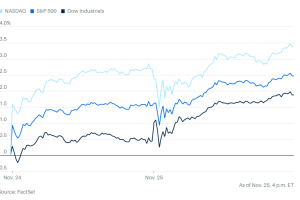 股市在美国感恩节前的星期二延续上涨行情,但投资者还在从人工智能相关股票中撤出。道琼斯工业指数上涨664点,涨幅1.4%。标准普尔500指数上涨0.9%。纳斯达克综合指数上涨0.7%。
