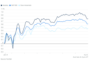 一份好坏参半的就业报告公布后,道琼斯工业平均指数和标准普尔500指数在周五收于新高,投资者在新年第一周涌入股市。道琼斯指数上涨238点,涨幅0.5%,标准普尔500指数上涨0.7%。纳斯达克综合指数上涨0.8%,但仍远低于历史高位。中小公司的罗素2000指数在周五上涨0.8%,本周涨幅超过三大指数,显示投资者正在从热门科技股撤出,转向市场中的其他板块。
