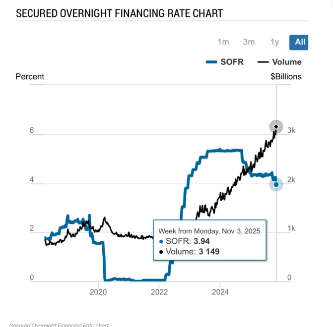 FX168财经报社(亚太)讯 知名财经网站Finbold周日(11月9日)报道称,11月6日,担保隔夜融资利率(SOFR)暴跌至3.92%,创两年新低,引发全球市场警觉。
