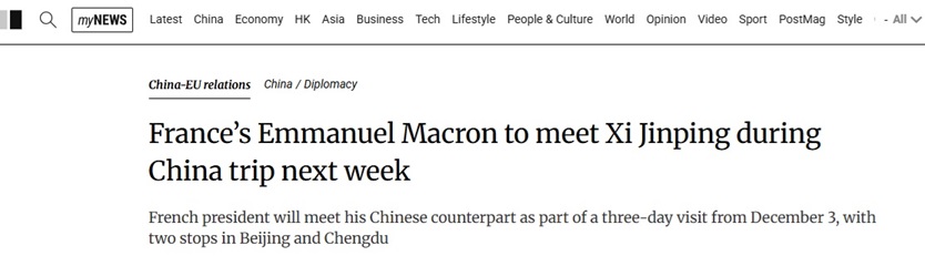 FX168财经报社(亚太)讯 香港《南华早报》周四(11月27日)报道称,法国总统府爱丽舍宫周三在一份声明中表示,法国总统马克龙(Emmanuel Macron)将于下周访问中国,并与中国国家主席习近平会晤。