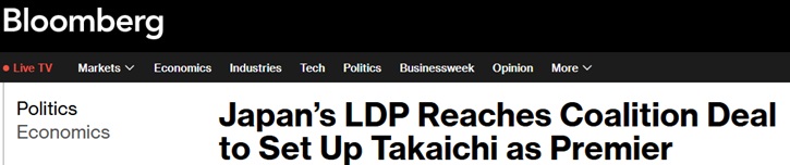 #日本市场#FX168财经报社(亚太)讯 美国彭博社周一(10月20日)最新报道称,据日本维新会领导人称,执政党自民党将于周一晚些时候与维新会签署联合执政协议,此举将使高市早苗(Sanae Takaichi)成为日本首位女首相。