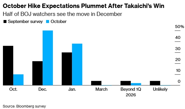 彭博调查显示,在50位经济学家中,约有10%预测日本央行将在10月30日为期两天的政策会议结束时加息,这一比例较上次调查的36%大幅下降。