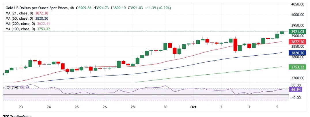 Mehta写道,周一,金价首次突破3900美元/盎司关口,并再次创下历史新高。对美国政府长时间停摆影响的担忧超过美元/日元反弹引领的美元涨势。黄金的4小时走势图在短期内继续描绘出一幅看涨的画面。