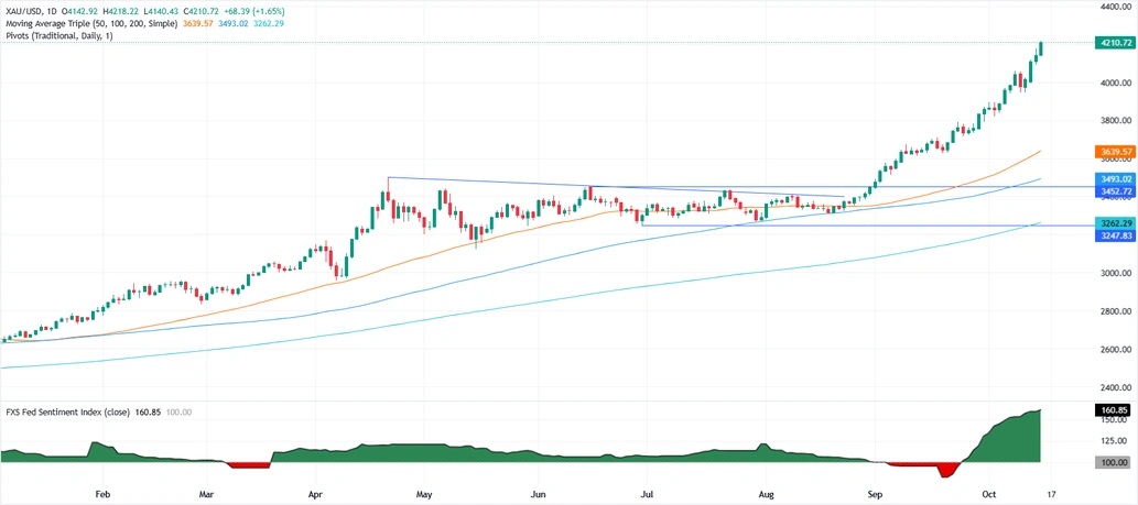 #黄金技术分析#FXStreet分析师Christian Borjon Valencia指出,尽管金价在4218美元/盎司附近的纪录高位下方盘整,但仍维持看涨倾向。势头继续对买家有利,相对强弱指数(RSI)保持在看涨区域,这表明上行压力仍然很大。