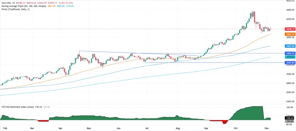 下行方面,Valencia补充道,若跌破10月28日低点3886美元/盎司,则可能下探50日SMA(约3854美元/盎司)。