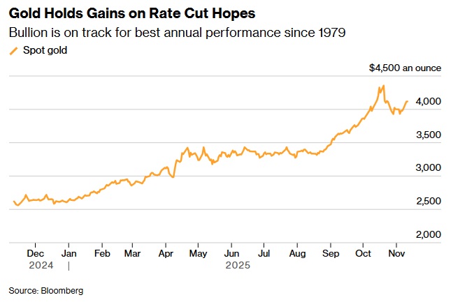 彭博社称,黄金价格在录得5月以来最大单日涨幅后保持涨势,美国历史上持续时间最长的政府停摆即将结束,这提高了进一步降息的可能性。