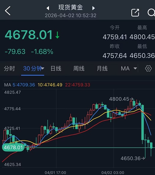 现货黄金价格最低跌至4650.36美元/盎司,较日内高点4800.45美元/盎司回落150美元。