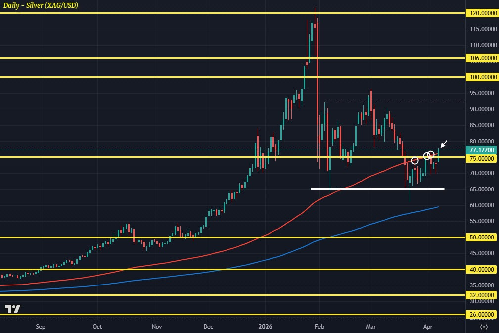 从技术图形来看,白银当前走势也颇具看点。白银今日大幅反弹,目前正试图站上100日移动均线(红线)。当前关键水平在76.11美元附近。若能守稳这一水平上方,买方将有望据此建立新的上行平台,并推动新一轮涨势;反之,若价格重新跌回该水平下方,卖方仍将有机会依托这一位置继续施压。