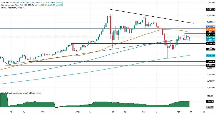 Valencia表示,若现货黄金价格能突破4750美元/盎司这一关键心理阻力位,将为其进一步上行打开空间,下一个阻力位将指向4800美元/盎司。若能突破该水平,金价有望向下一个值得关注的区域发起冲击——即4月8日创下的4857美元/盎司高点,紧随其后的阻力位则是位于4897美元/盎司的50日SMA。