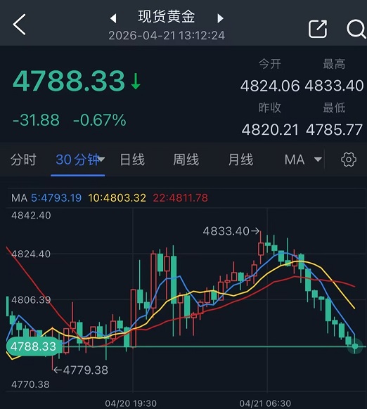 金价目前位于4788美元/盎司附近,日内重挫逾30美元;稍早金价最低触及4785.77美元/盎司