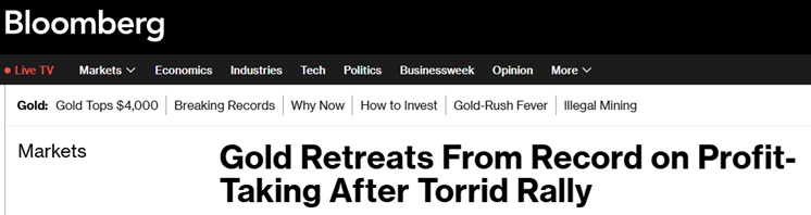 24K99讯 美国彭博社周四(10月9日)报道称,金价从周三创下的4000美元/盎司以上的纪录高位回落,此前的强劲上涨使得这种贵金属容易出现回调。