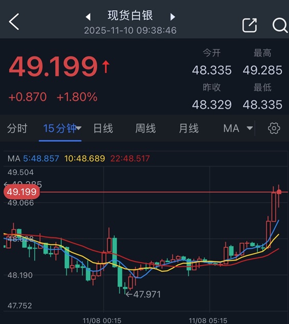银价也同步暴涨。现货白银站上49美元/盎司关口,目前位于49.20美元/盎司,日内飙涨近2%。