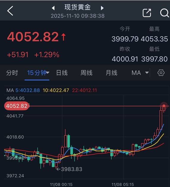 现货黄金价格目前最高触及4053.35美元/盎司,刷新日内高点。