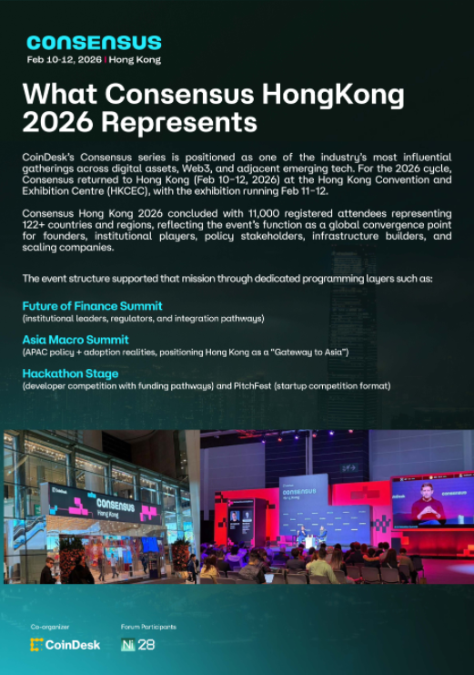 Consensus Hong Kong 2026 並不是一般意義上的「會展週」。它更像是一個把整個數位資產產業壓縮到同一個空間的高密度場域——資本、監管、機構、建設者與媒體在此交會,市場在這裡判斷什麼是真實、什麼是可被放大、什麼是下一步。