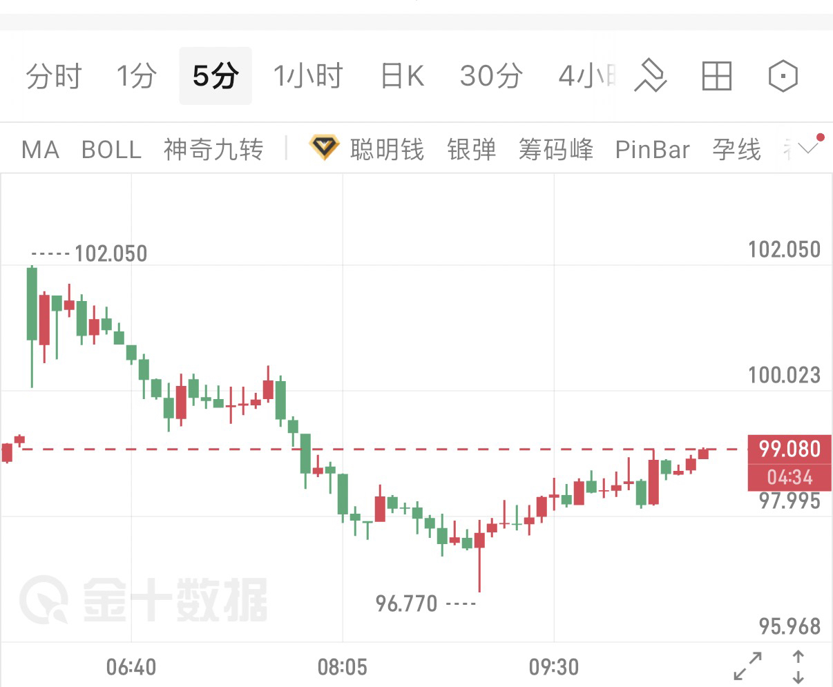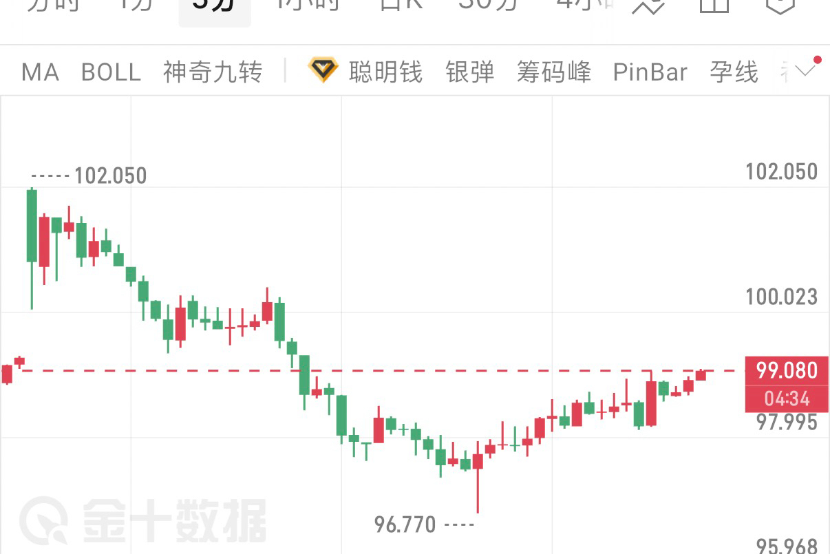 油价自102.050回落至96.770后企稳反弹,当前99.080处于低位震荡修复。上方压力100.023突破看102.050,下方支撑97.995跌破看96.770