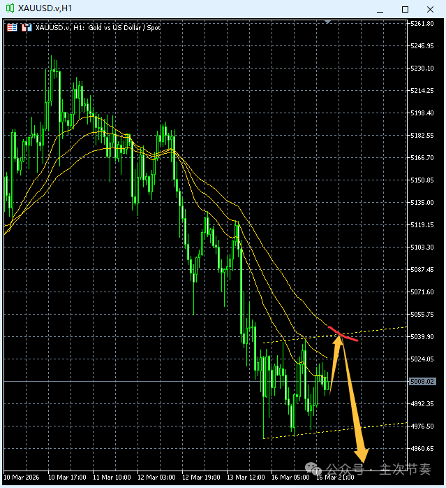一句话看懂黄金Gold:短线下跌后,低位呈无力度次要节奏反弹,意味着日内还有新低。