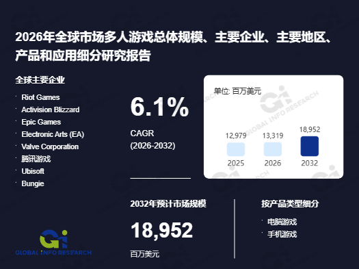据GIR (Global Info Research)调研,2025年全球多人游戏收入大约12979百万美元,预计2032年达到18952百万美元,2026至2032期间,年复合增长率CAGR为6.1%。