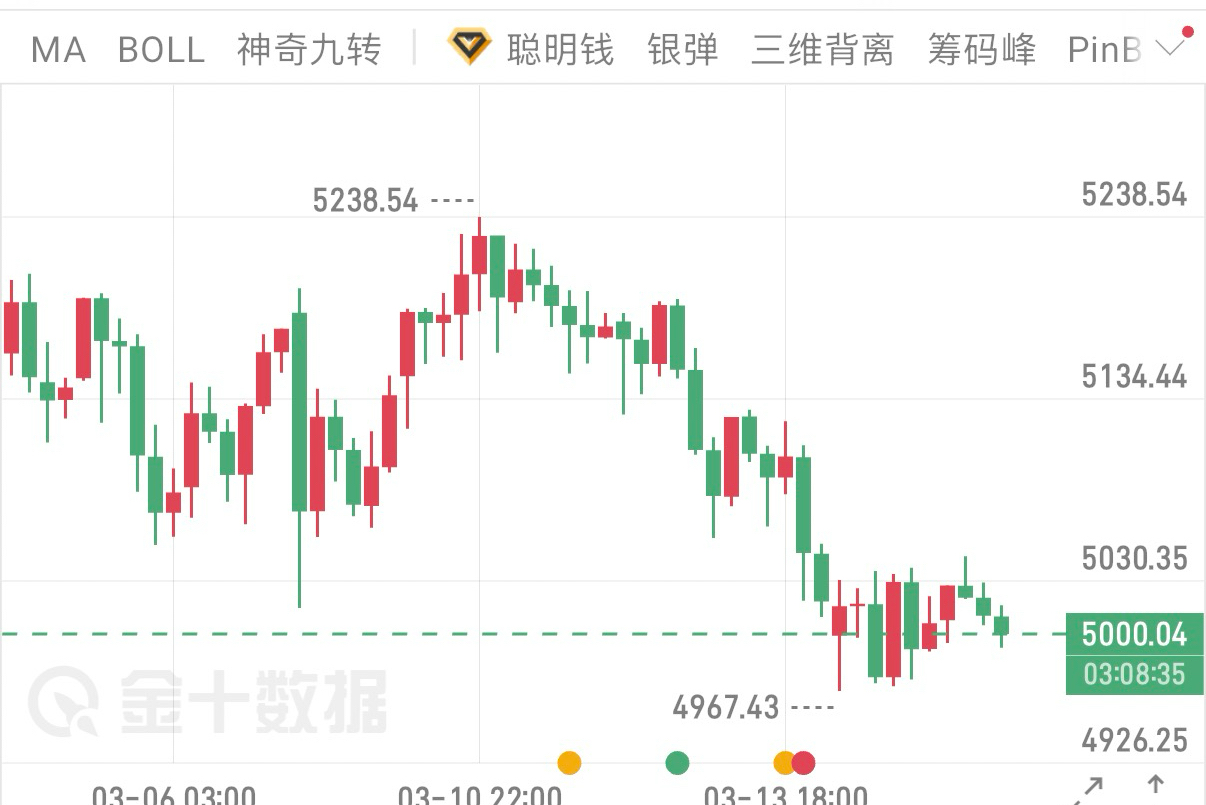 价格自高位5238.54回落,连续下破关键支撑位,目前在5000关口附近震荡,最低触及4967.43,形成清晰的下行通道。