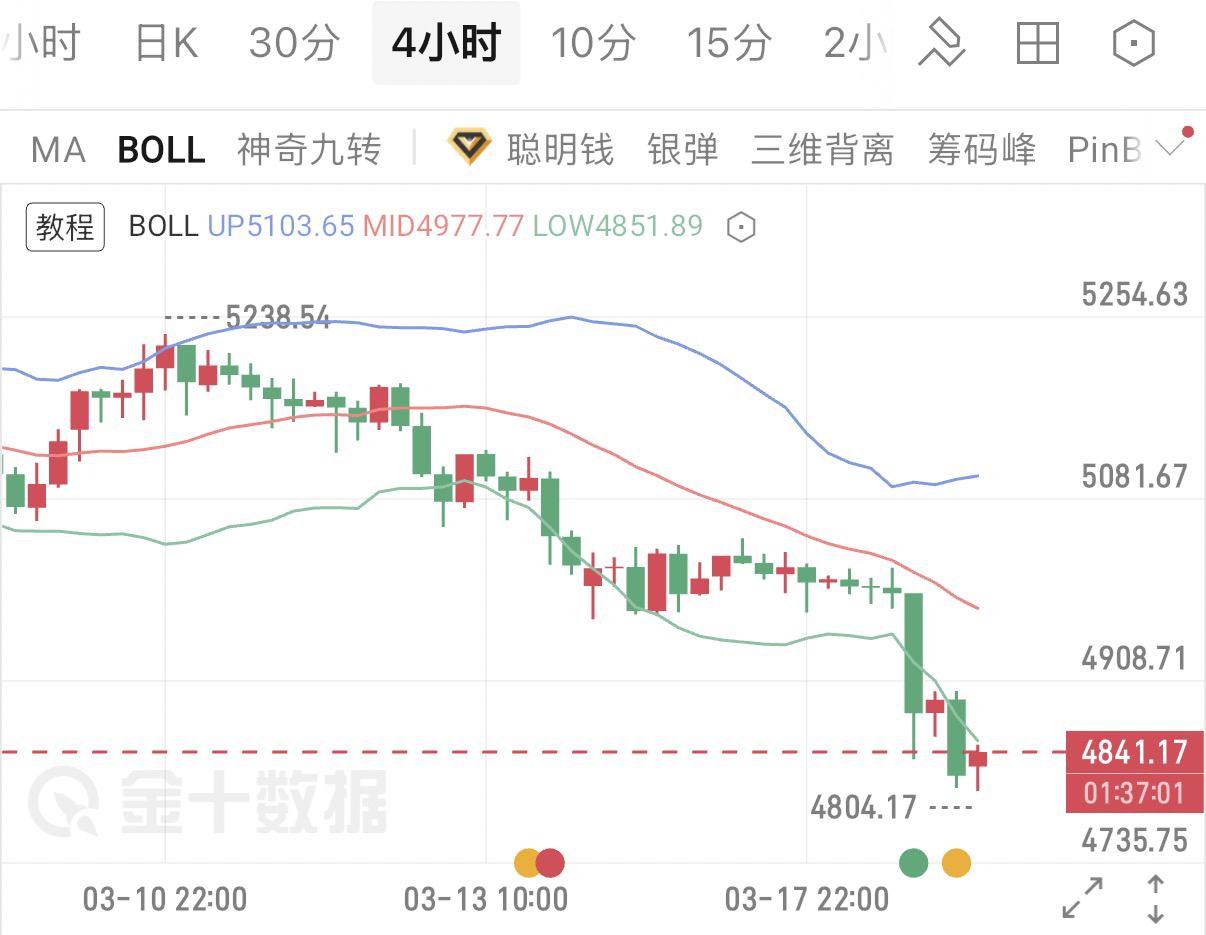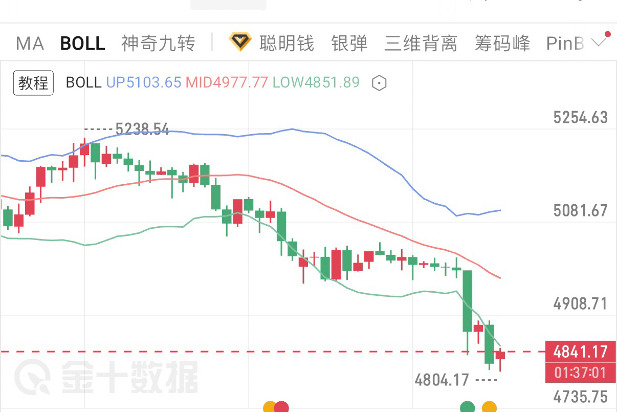 昨天金价延续回落,最低触及4804附近后小幅反弹,目前在4840一带震荡整理。从4小时图看,价格已经跌到布林下轨附近,短期超跌后有明显的止跌修复迹象,下方4800-4810区域支撑比较扎实。