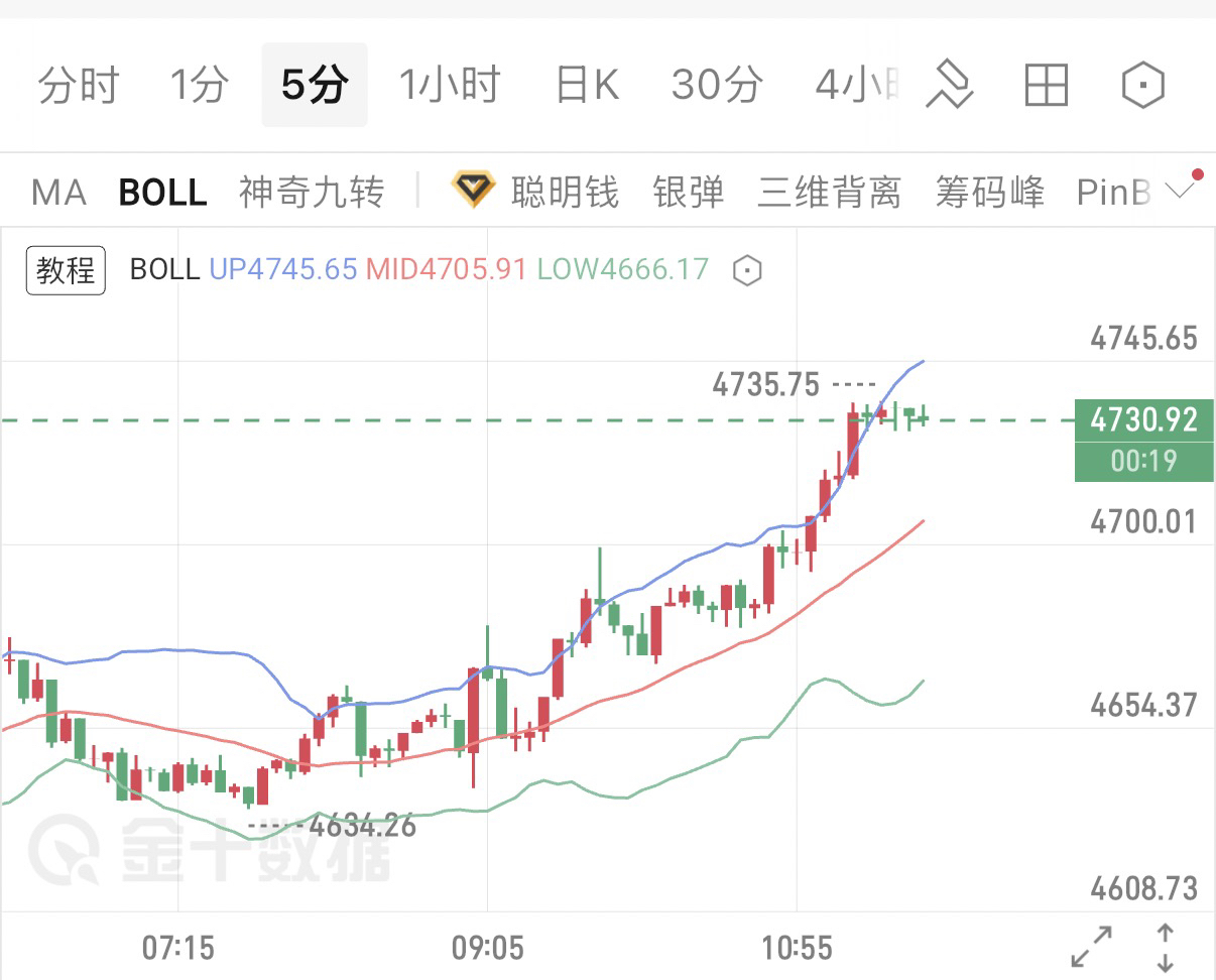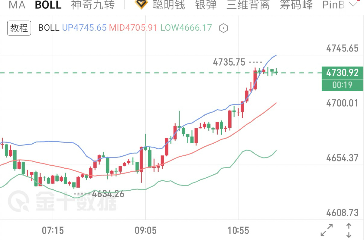 价格沿上轨强势攀升,当前报价4730.92,已突破前高4735.75附近压力,布林带开口持续放大,多头动能释放充分。