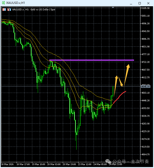 一句话看懂黄金Gold:尾盘上穿小时图均线系统,短线进入向上回升阶段。