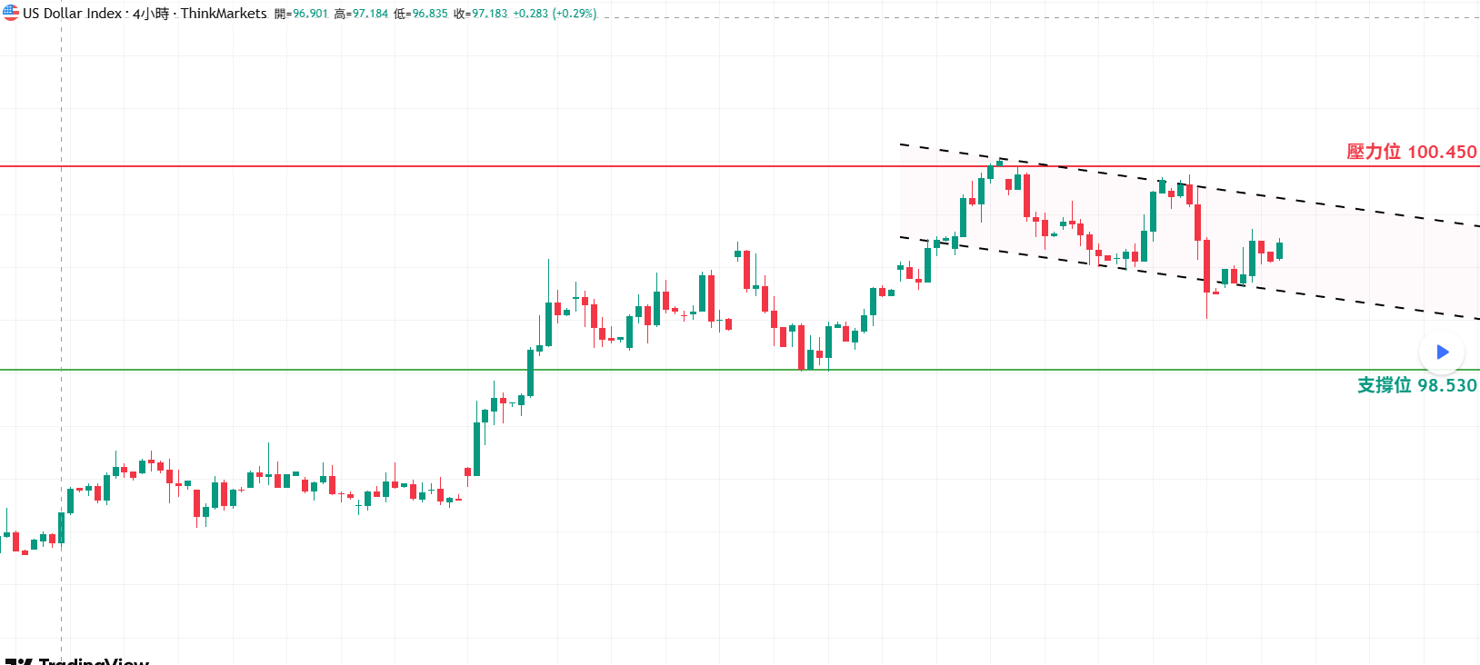 • 反之,若是價格成功下破旗形,則證明美元趨勢開始轉弱甚至反轉,需關注支撐位98.530。