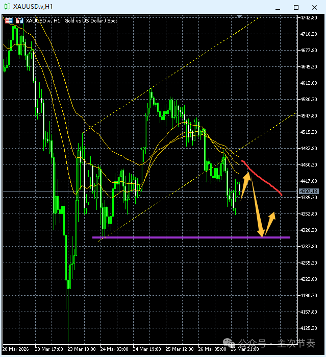 一句话看懂黄金Gold:短线震荡基调不变,处于小区间内的下行过程。
