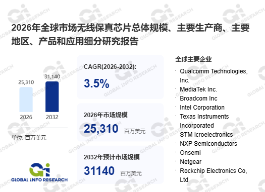 据GIR (Global Info Research)调研,按收入计,2025年全球无线保真芯片收入大约24520百万美元,预计2032年达到31140百万美元,2026至2032期间,年复合增长率CAGR为3.5%。